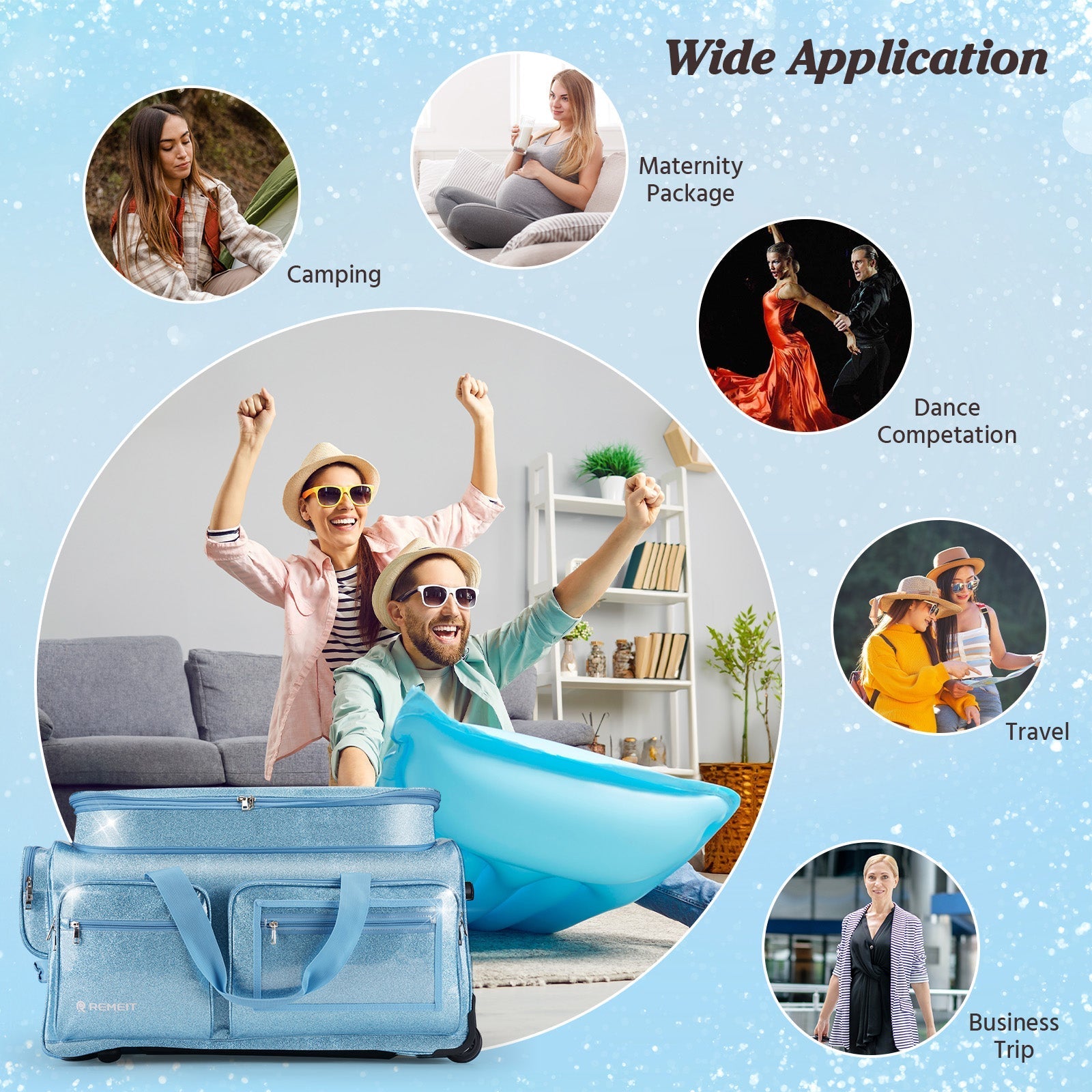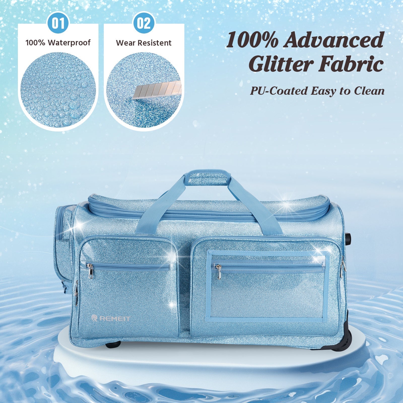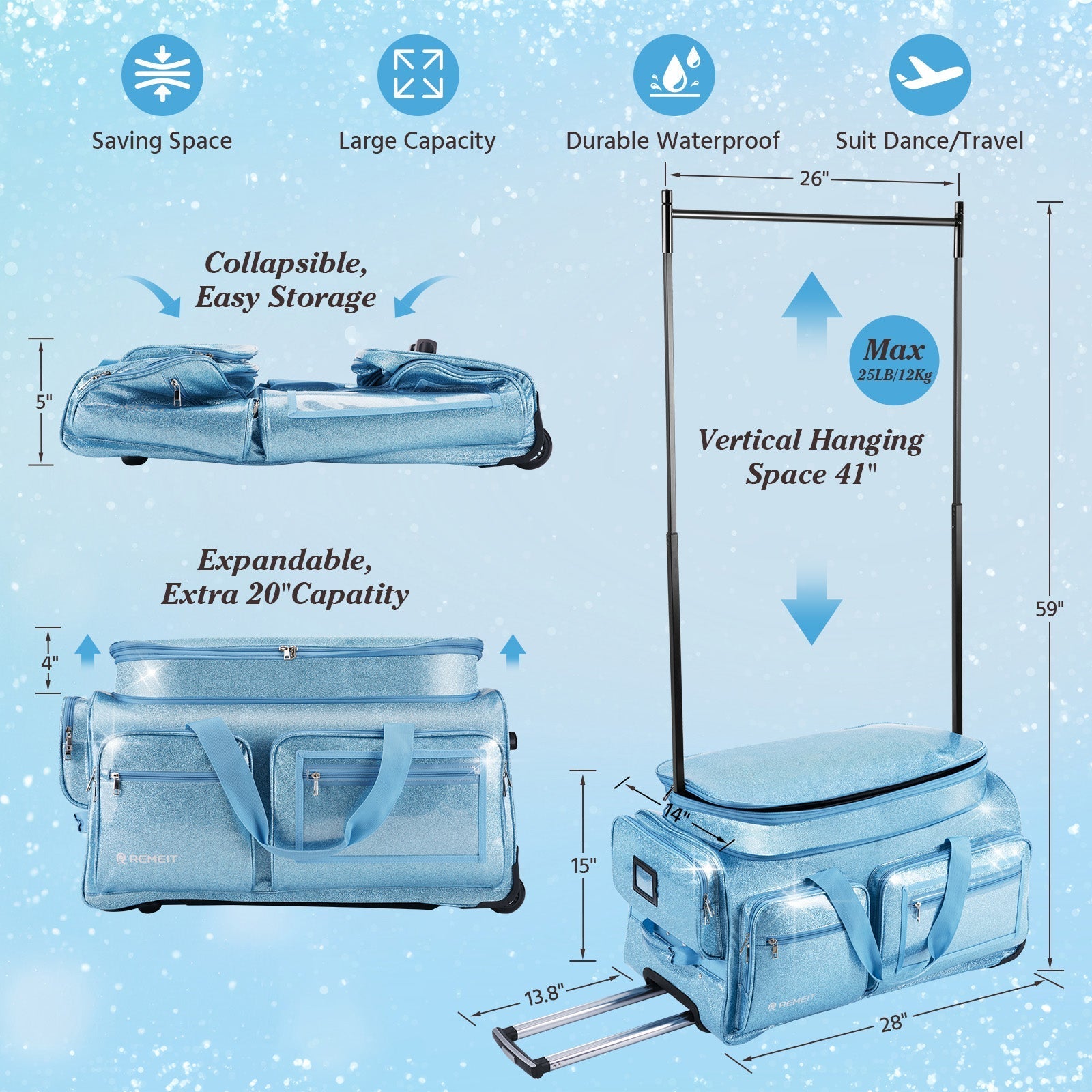 💙 REMEIT 28” Glitter Blue Dance Bag with Garment RackCollapsible Rolling Dance Competition Bag | 120L Large Storage | Portable Wardrobe for Dancers